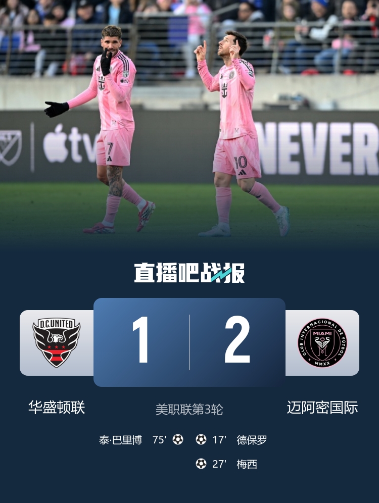 03月08日讯 今日早晨进行的美职联第3轮,迈阿密国际2-1客场战胜华盛顿联,收获2连胜。