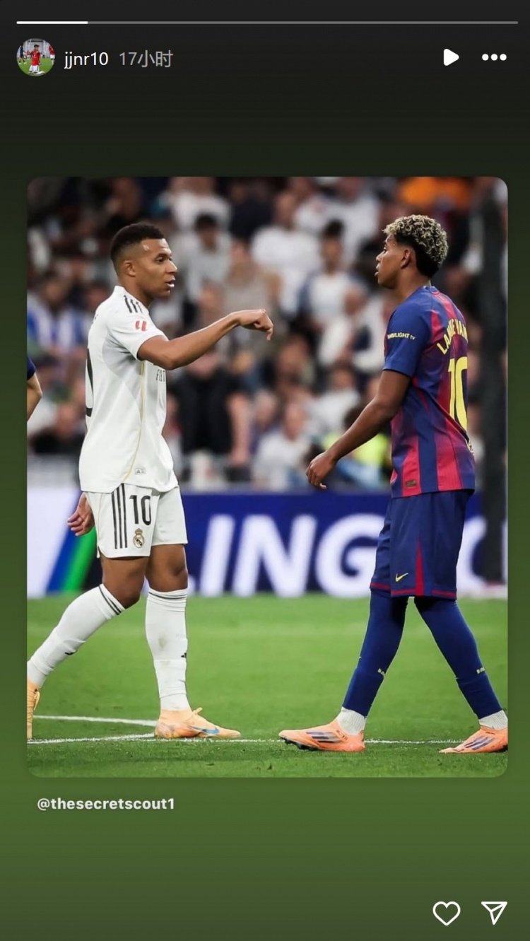 曼联15岁前锋JJ-加布里埃尔也在关注西班牙国家德比,他在社交媒体上转发姆巴佩、亚马尔的赛场照片。